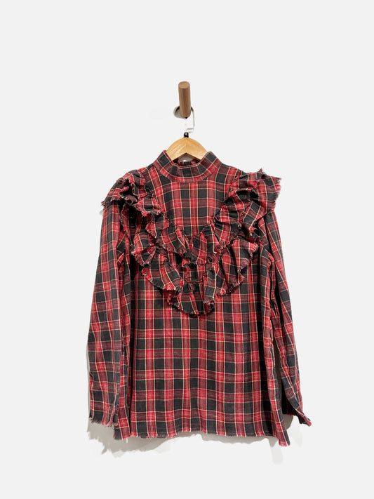 $$ Zara Woman Red and Black Plaid Ruffle Flannel - XS