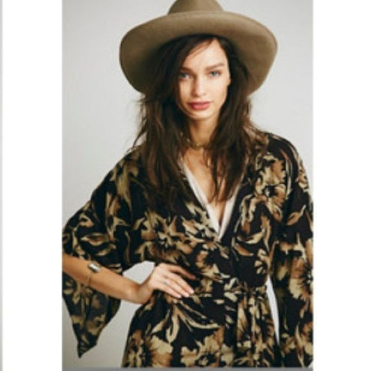 Free People + Love Project Brown Floral Printed Kimono Wrap Size Medium