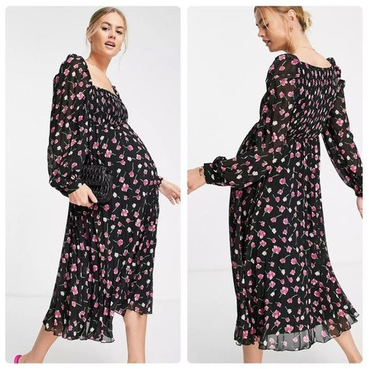 Asos NWT Maternity Square Neck Pleated Midi Dress in Floral Print Size 16