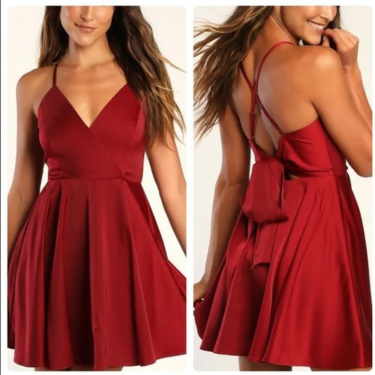 NWT Lulus Add Some Glam Wine Red Satin Tie-Back Skater Dress Size Large