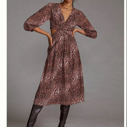 Anthropologie Ranna Gill Leopard Print Midi Dress Size Medium