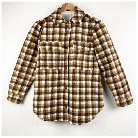 Treasure & Bond Puff Sleeve Button Shacket Olive-brown Jade Check Size Small