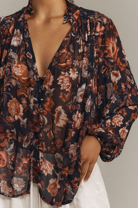 Anthropologie Navy and Red Floral Long Sleeve Blouse - Small