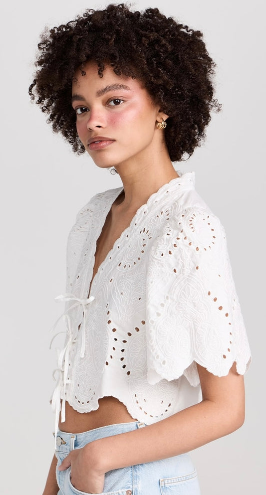 Moon River White Eyelet Tie Front Blouse - Medium