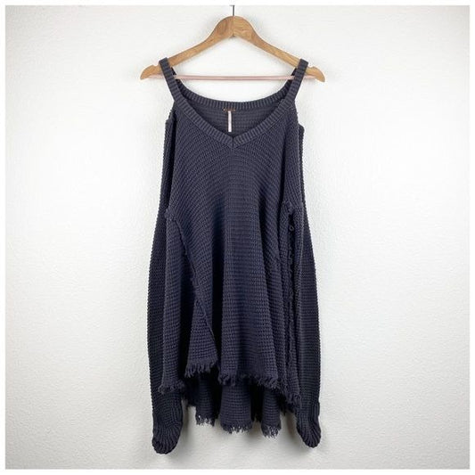 Free People Moonshine V-Neck Charcoal Distressed Waffle Knit Sweater Size Small