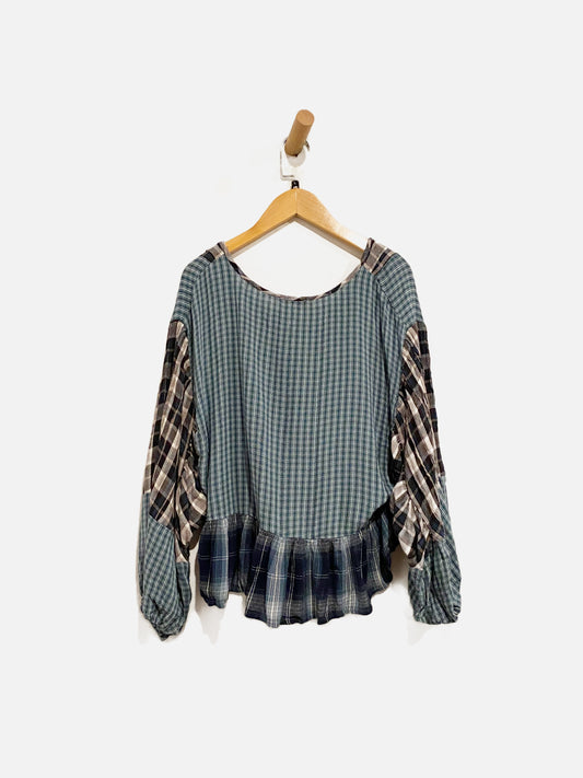 American Eagle Blue Plaid Ruffle Blouse - Large