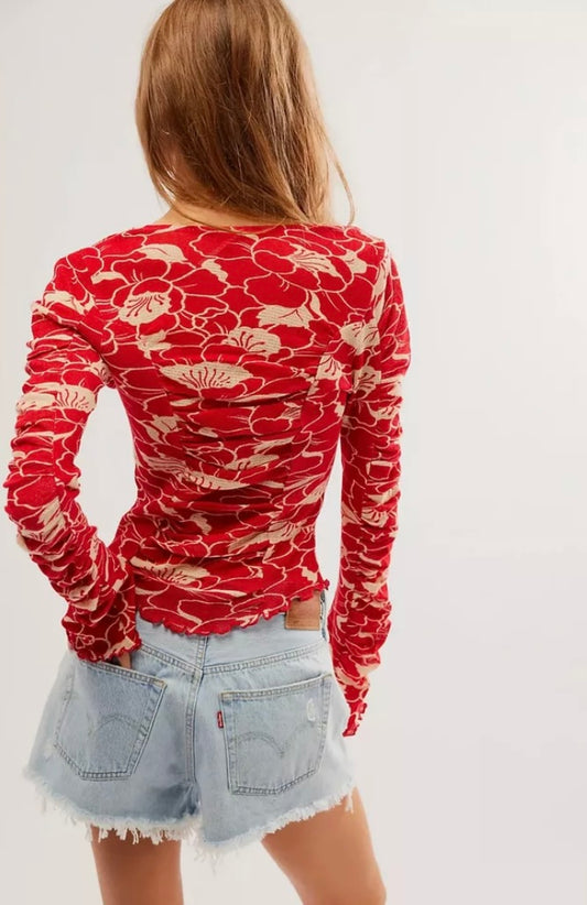 Free People Through the Meadow Red Floral Rushed Top - XS