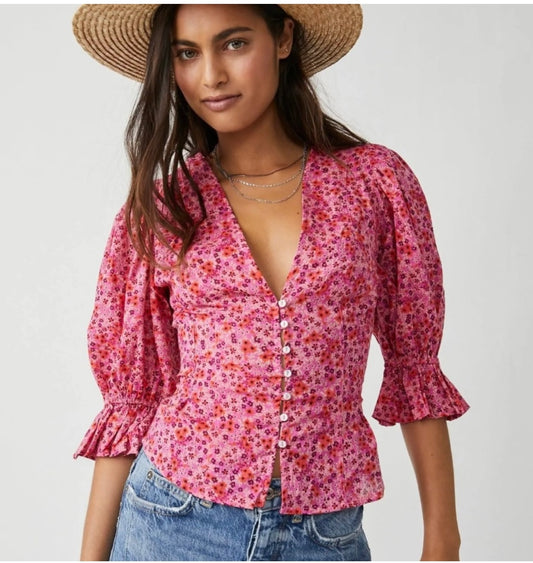 Free People Found You Pink Floral V-Neck Button Front Blouse - XL