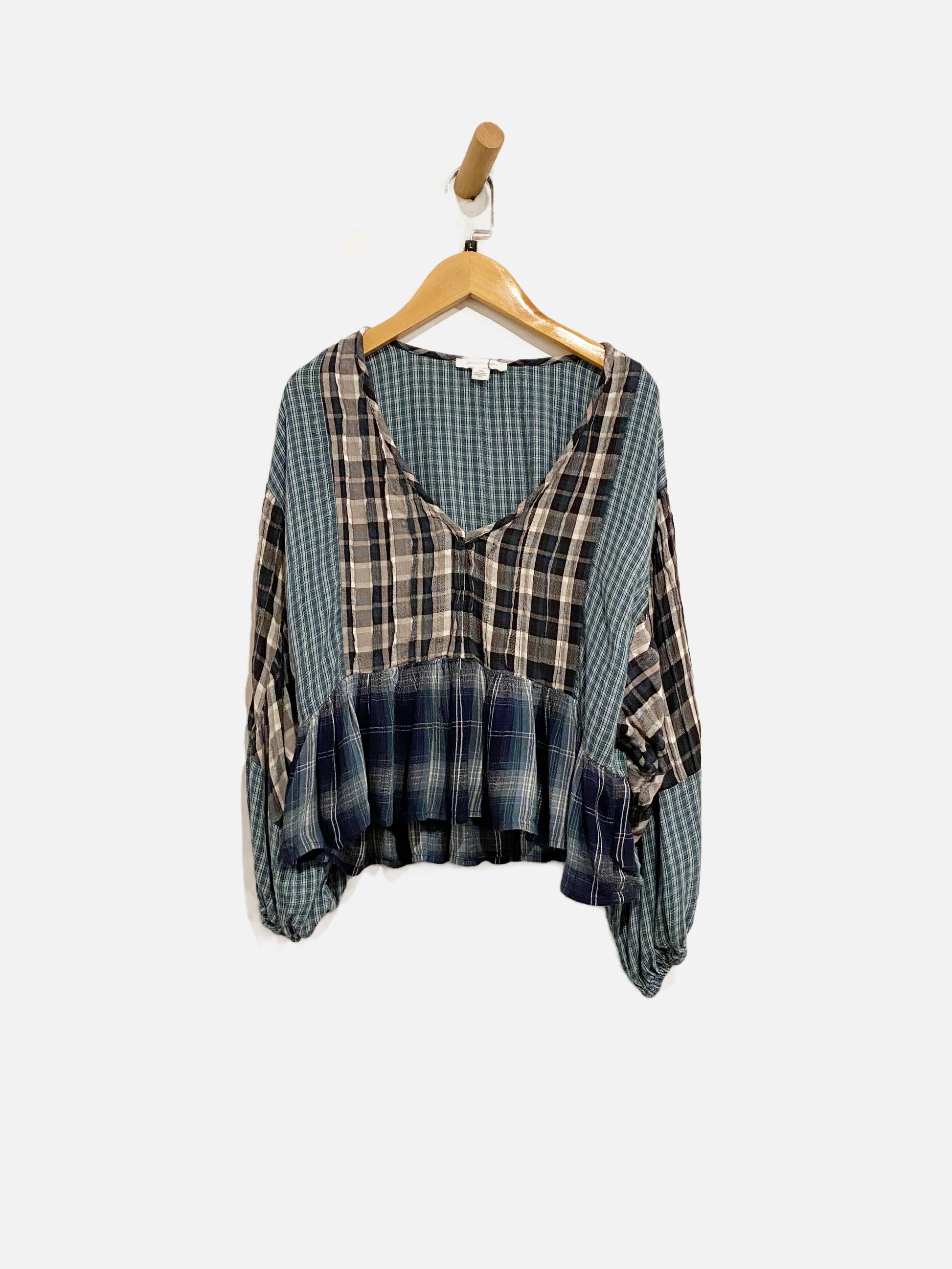 American Eagle Blue Plaid Ruffle Blouse - Large