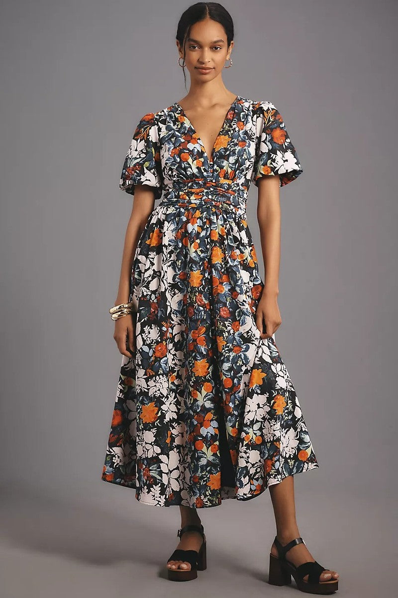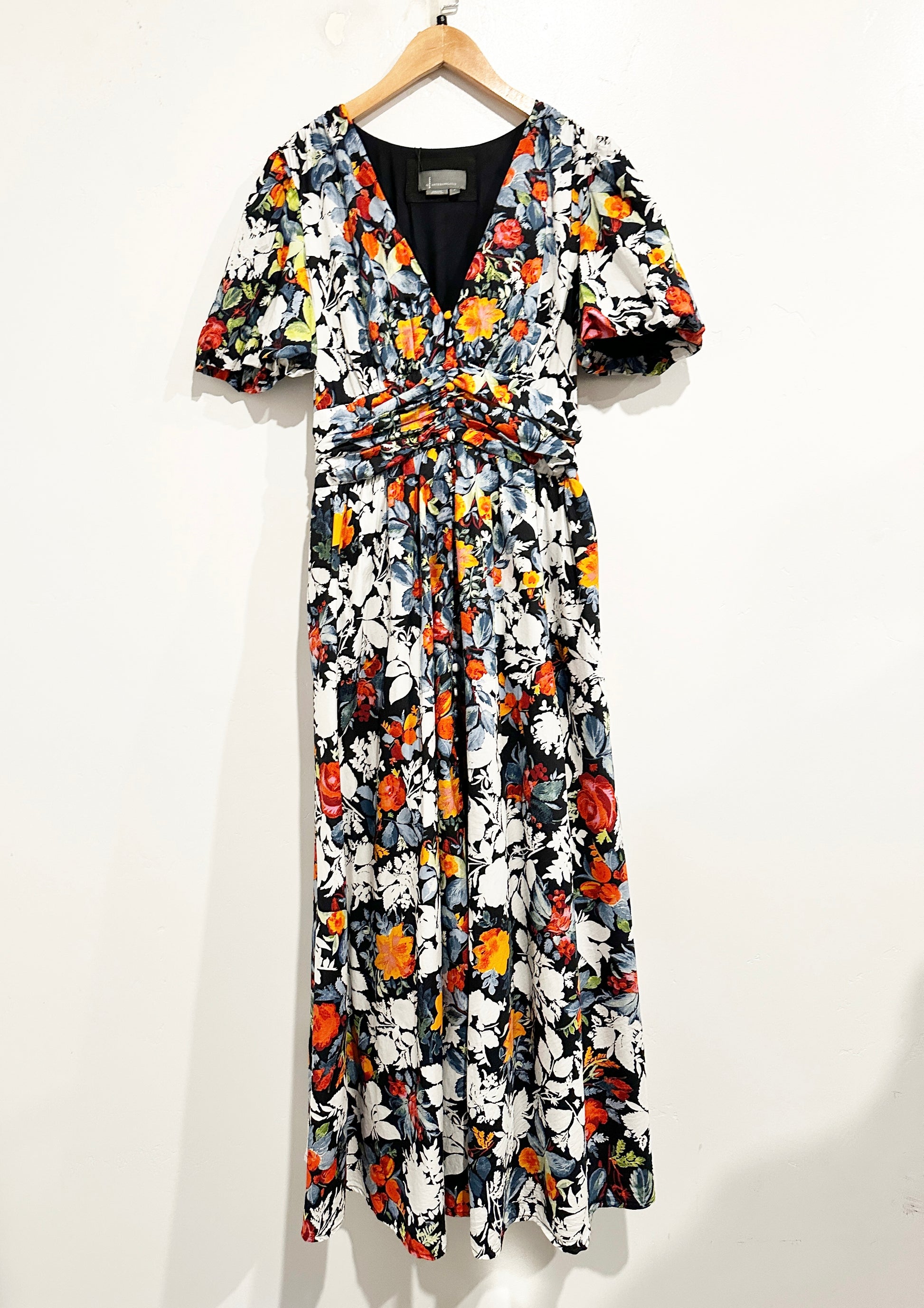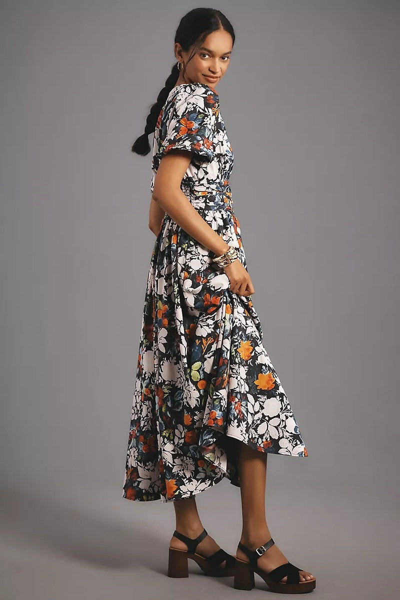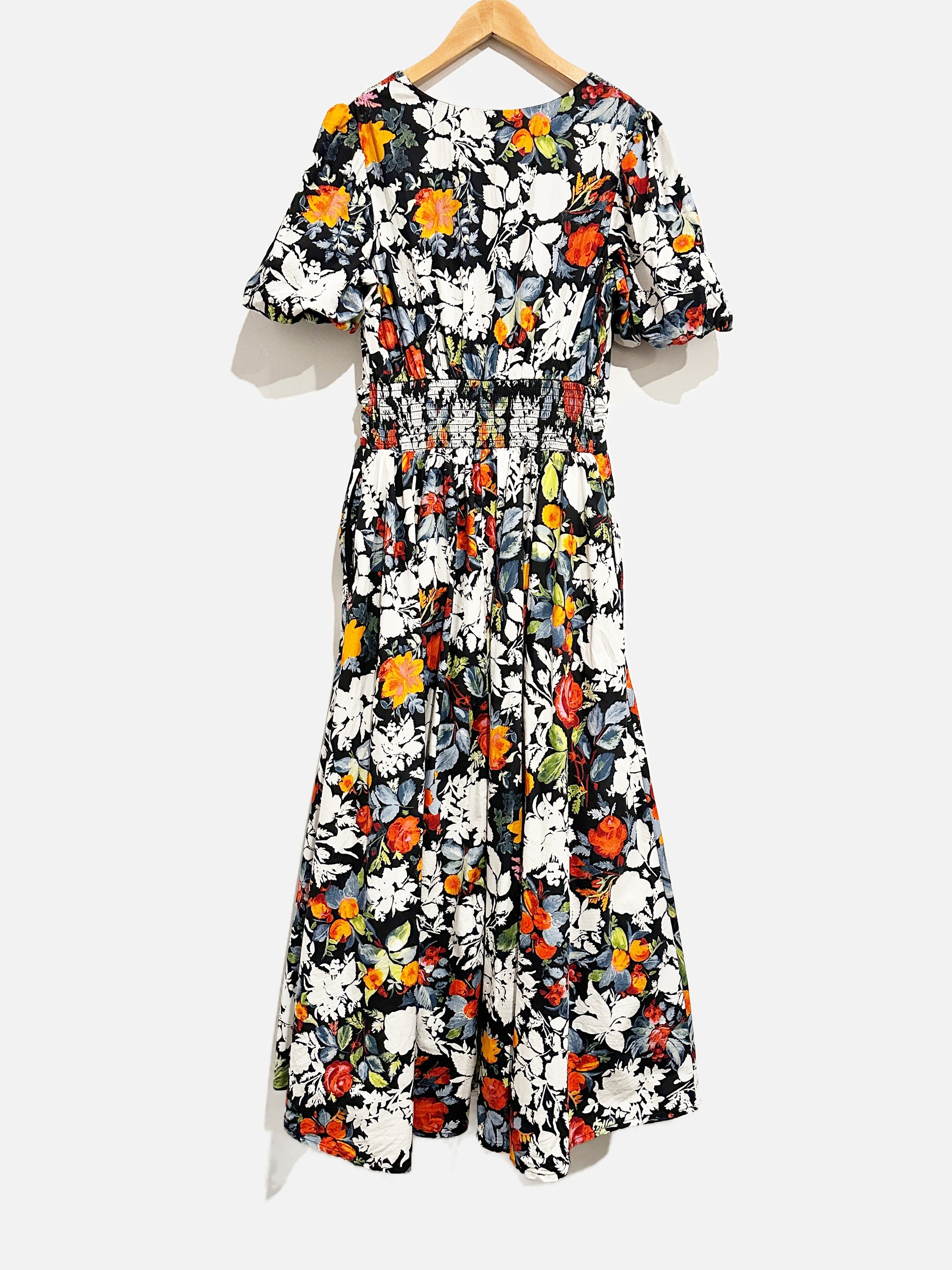 Anthropologie Black Floral Puff Sleeve Midi Dress - Small
