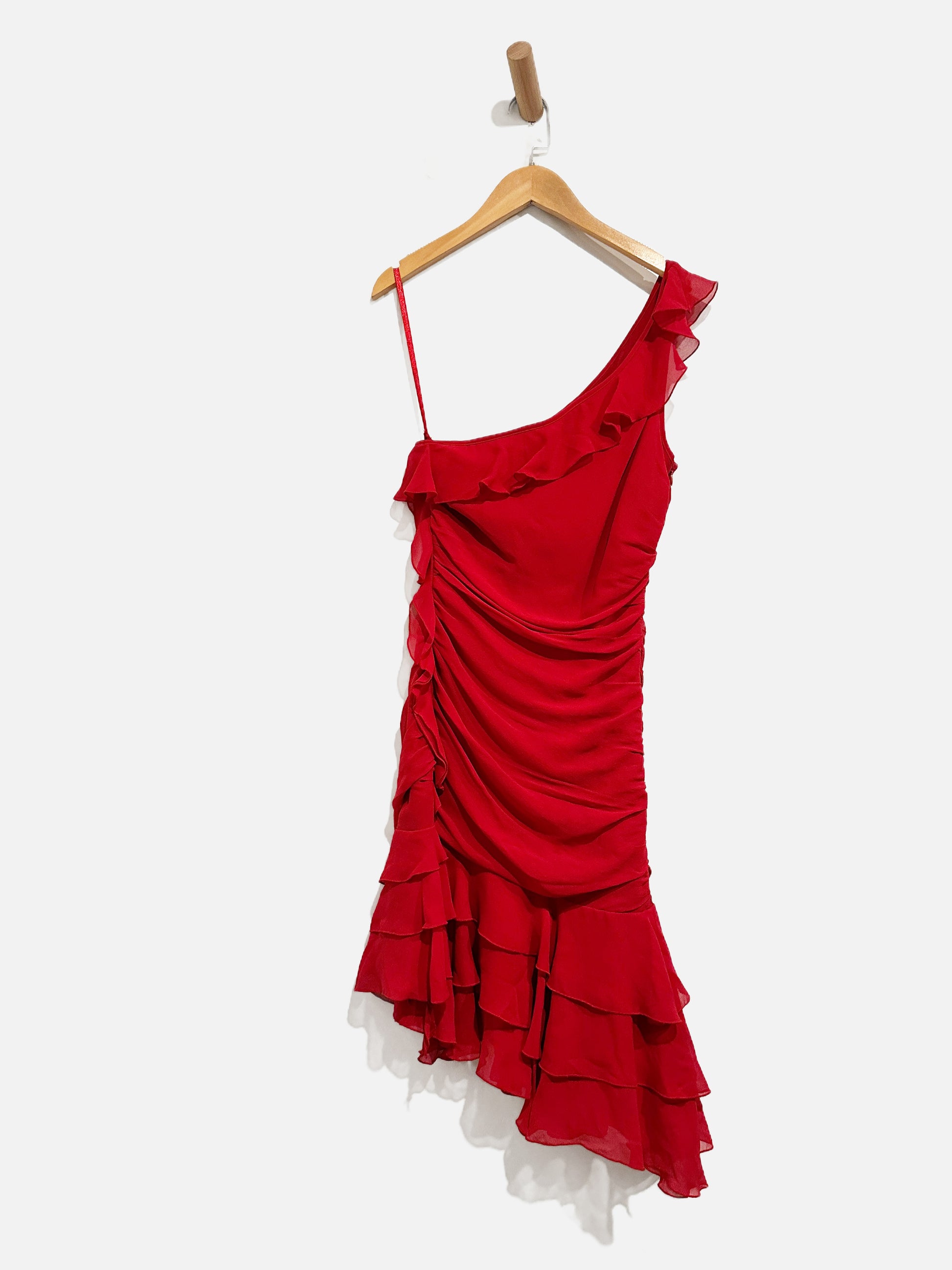Express Y2K Red Silk Ruffle Asymmetric Dress - 4