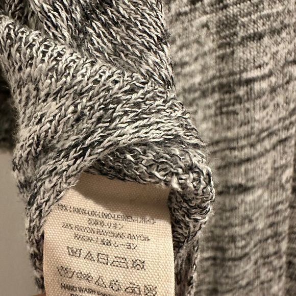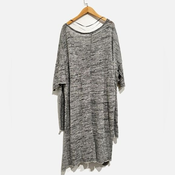 In a lightweight linen-blend, this semi-sheer sweater is in an oversized silhouette. Front slip pockets. High low hem and dramatic side vents. Exposed seam detailing.