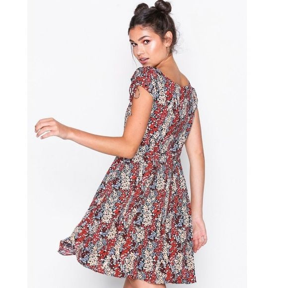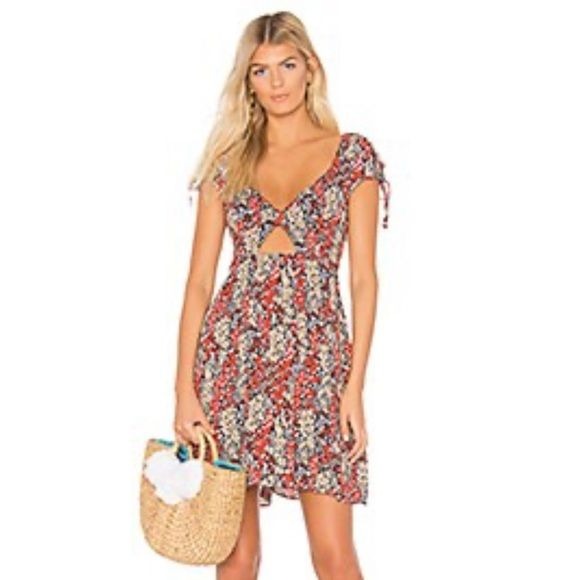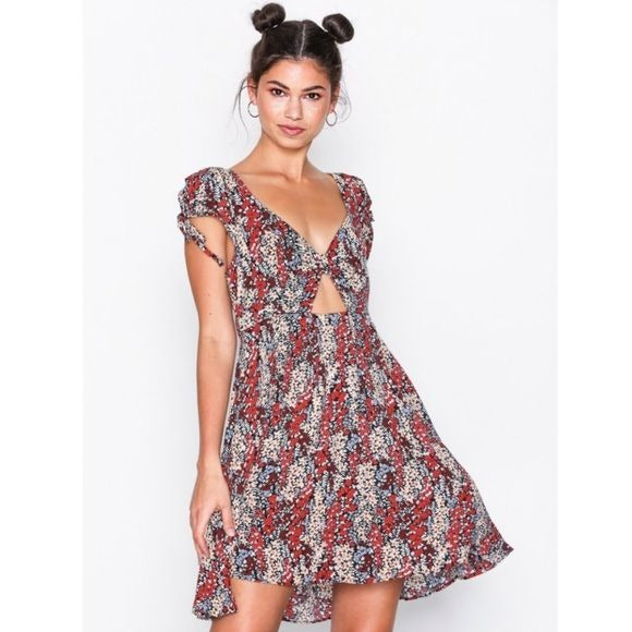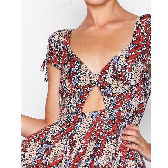 Free People Miss Right Floral Dress Size Medium Short cap sleeves frame a darling sweetheart neckline and a fitted bodice (all made from breezy woven fabric) with a flirty center cutout. A banded, fitted waist tops a twirly, slightly flared mini skirt. Hidden back zipper. Side seam pockets