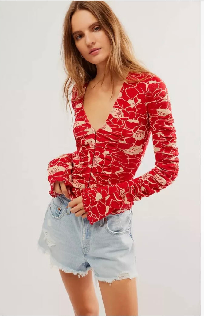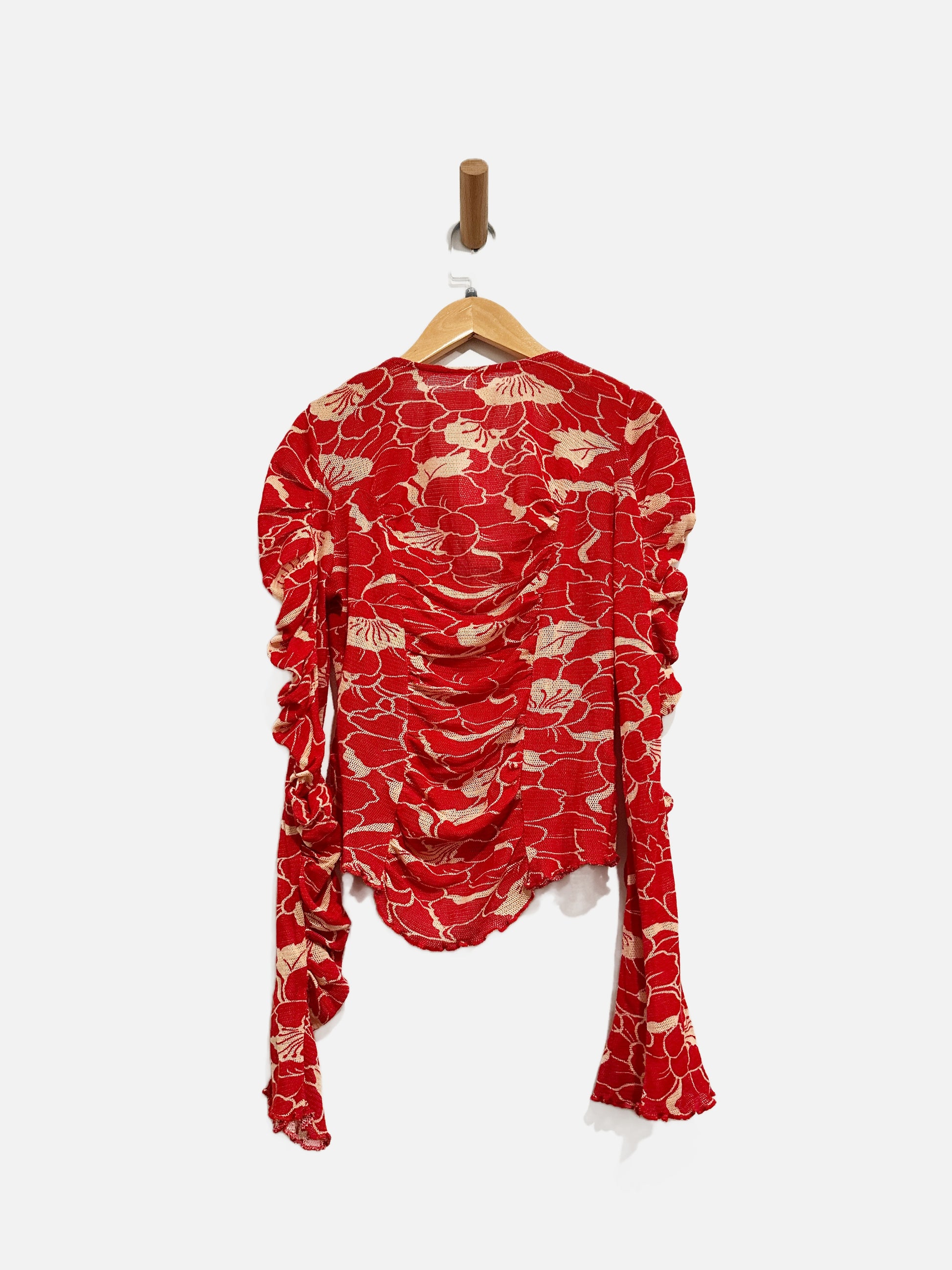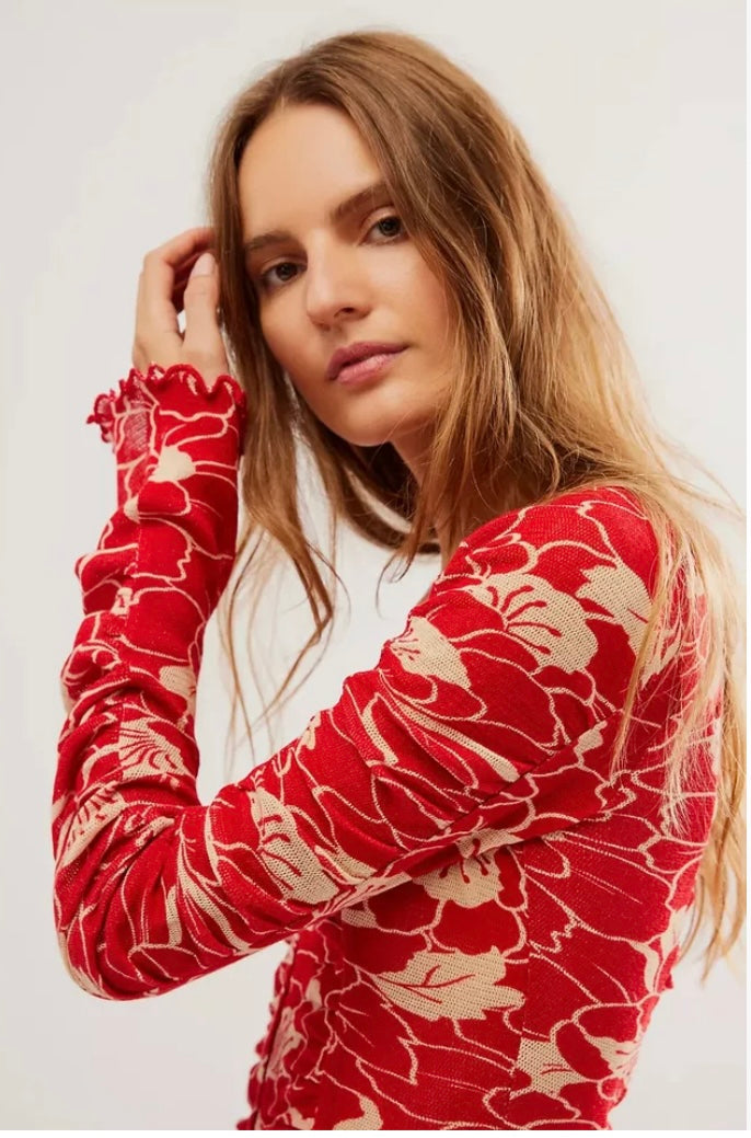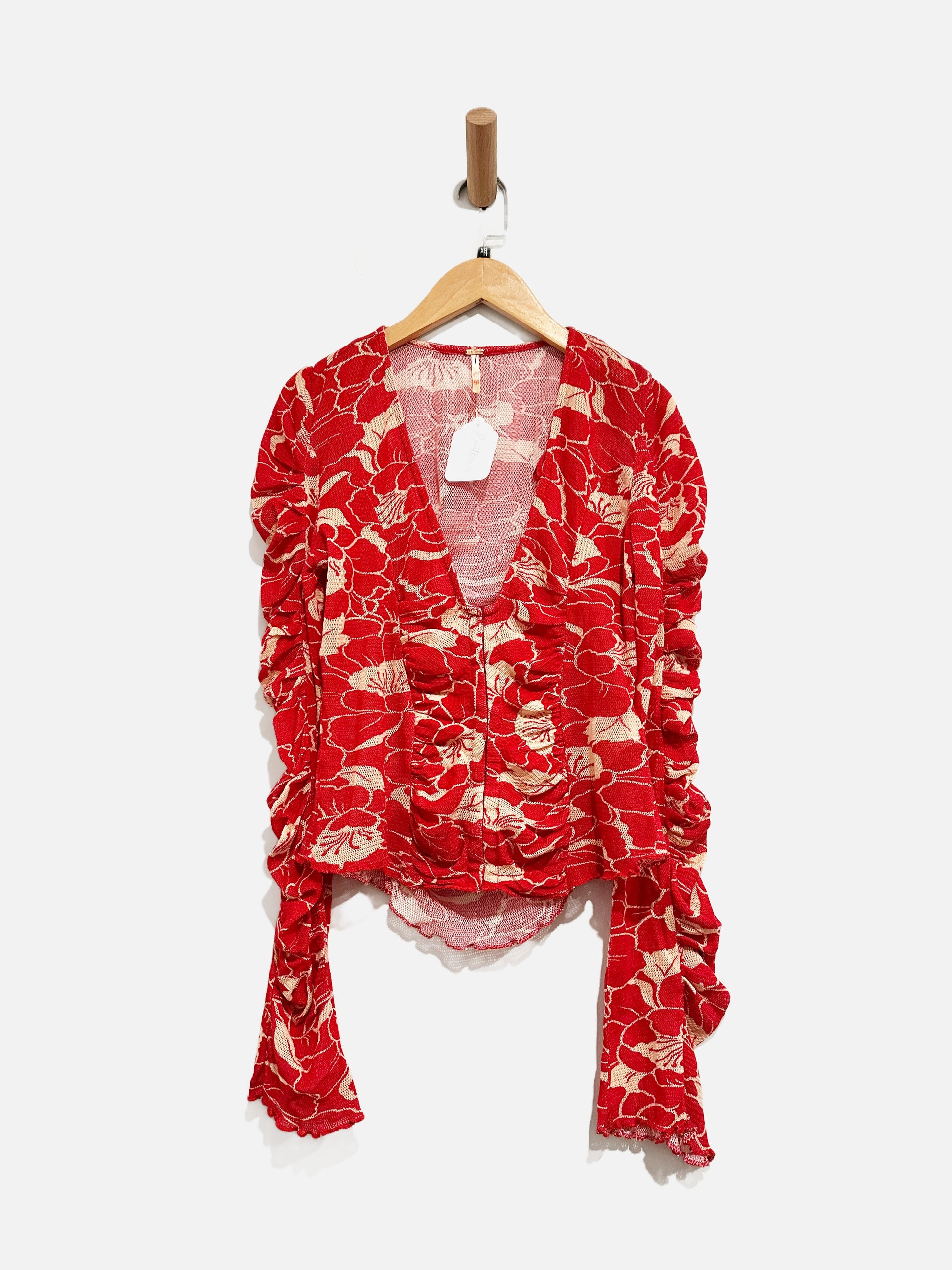 Free People Through the Meadow Red Floral Rushed Top - XS
