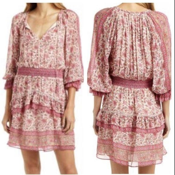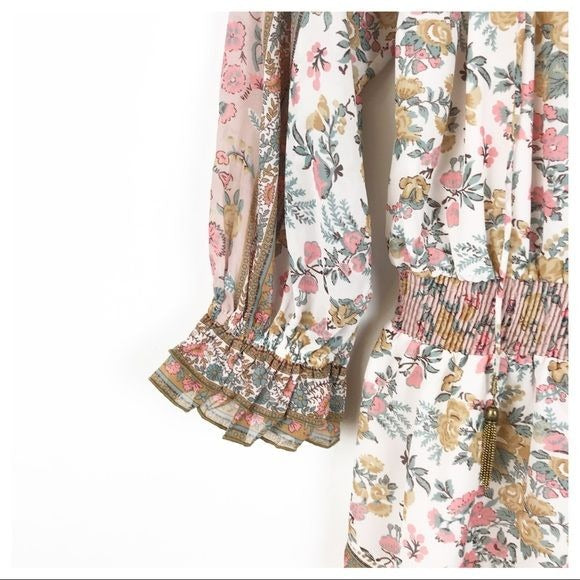 This romantic mini dress in our Tippy Border print is perfect for spring summer. The perfect shade of pink looks good on anyone. Smocked detail waistband and arm openings make this silhouette look good on any body type. The open neckline can be tied closed with the beautifully detailed tassels on the neckline.