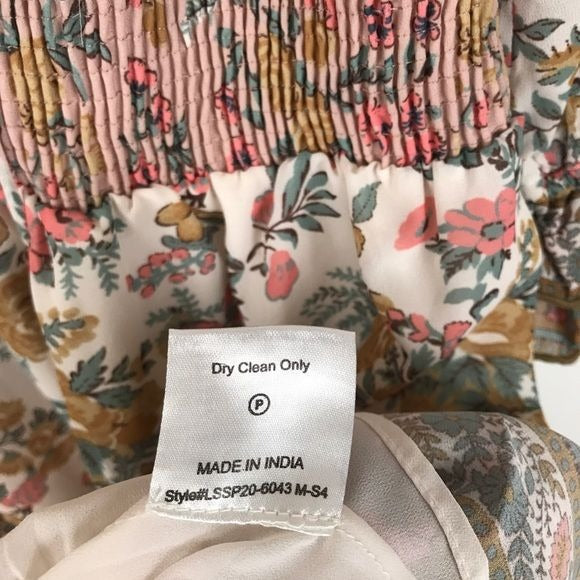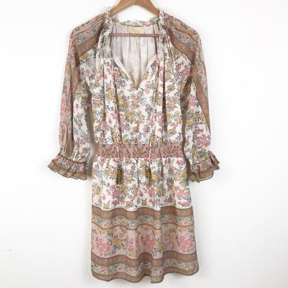 This romantic mini dress in our Tippy Border print is perfect for spring summer. The perfect shade of pink looks good on anyone. Smocked detail waistband and arm openings make this silhouette look good on any body type. The open neckline can be tied closed with the beautifully detailed tassels on the neckline.