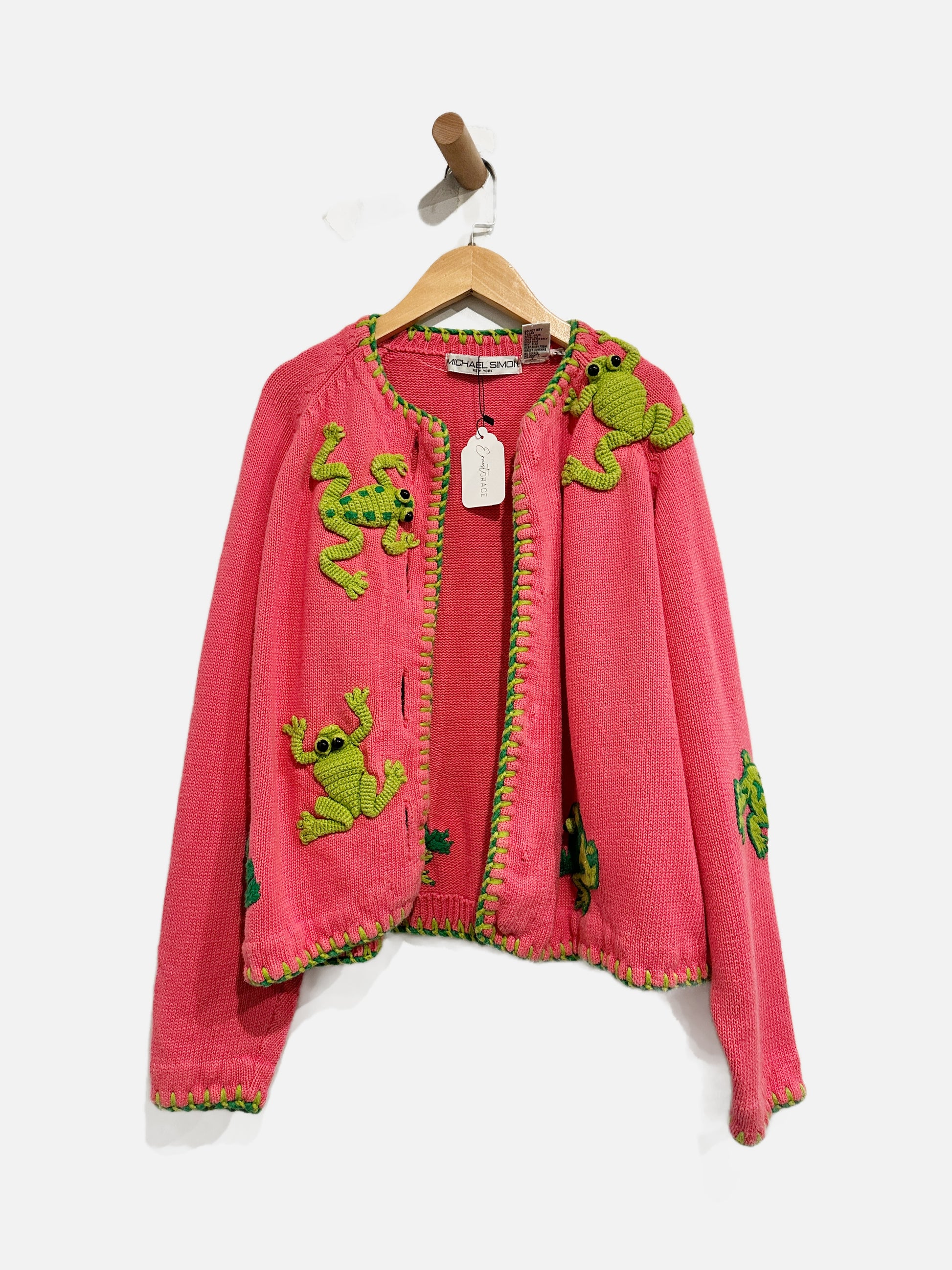 Vintage Michael Simon Pink Knit 3D Green Frogs Cardigan Sweater - O/S