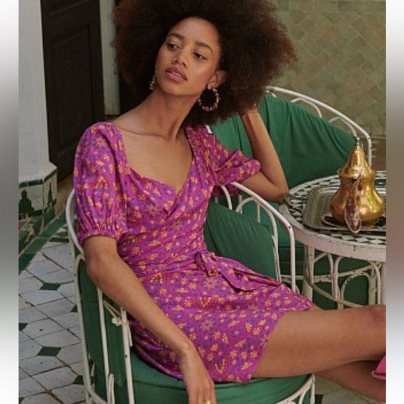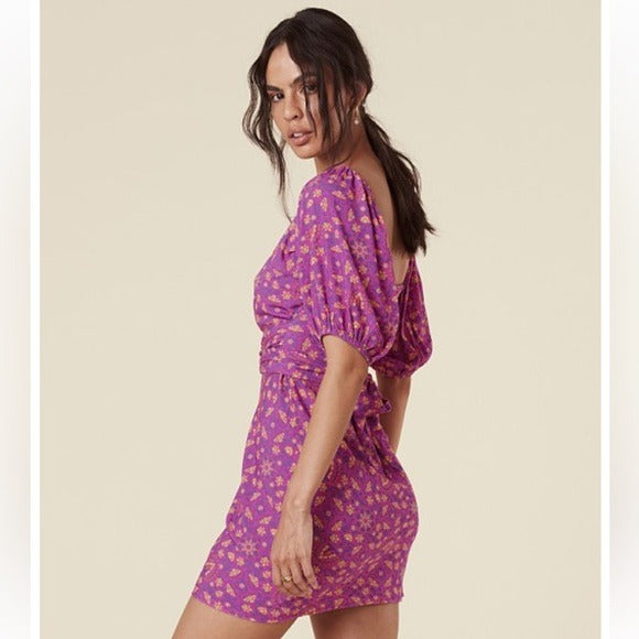 Madame Peacock sweetheart mini dress is featured in the exquisite signature Madame Peacock print, a stunningly bold boysenberry colorway and flattering bias cut skirt. True to size, this mini includes a soft and comfortable shirred back, elasticated shoulders and elasticated cuffs. Thick waist ties allow for different styling opportunities. It's your new versatile go-to piece for a night out with the girls. This mini dress is unlined. Lenzing Ecovero is biodegradable and compostable.