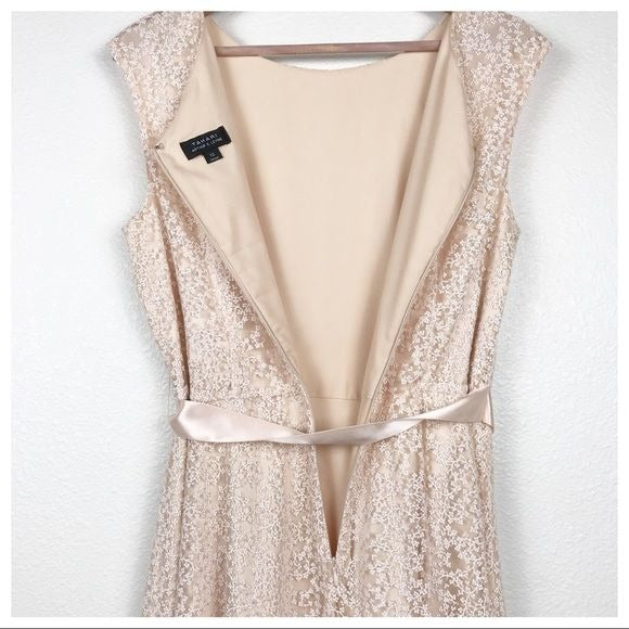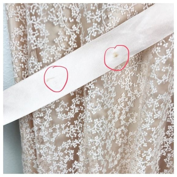 Light Pink with a floral and silver detail overlay-pink ribbon at waist