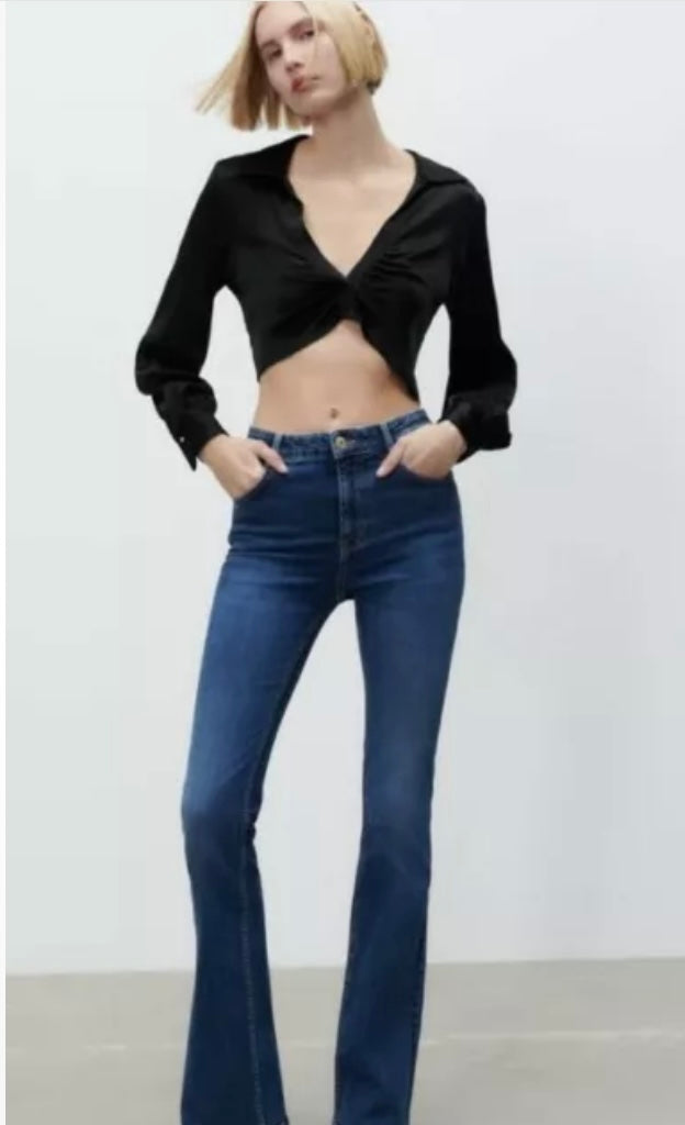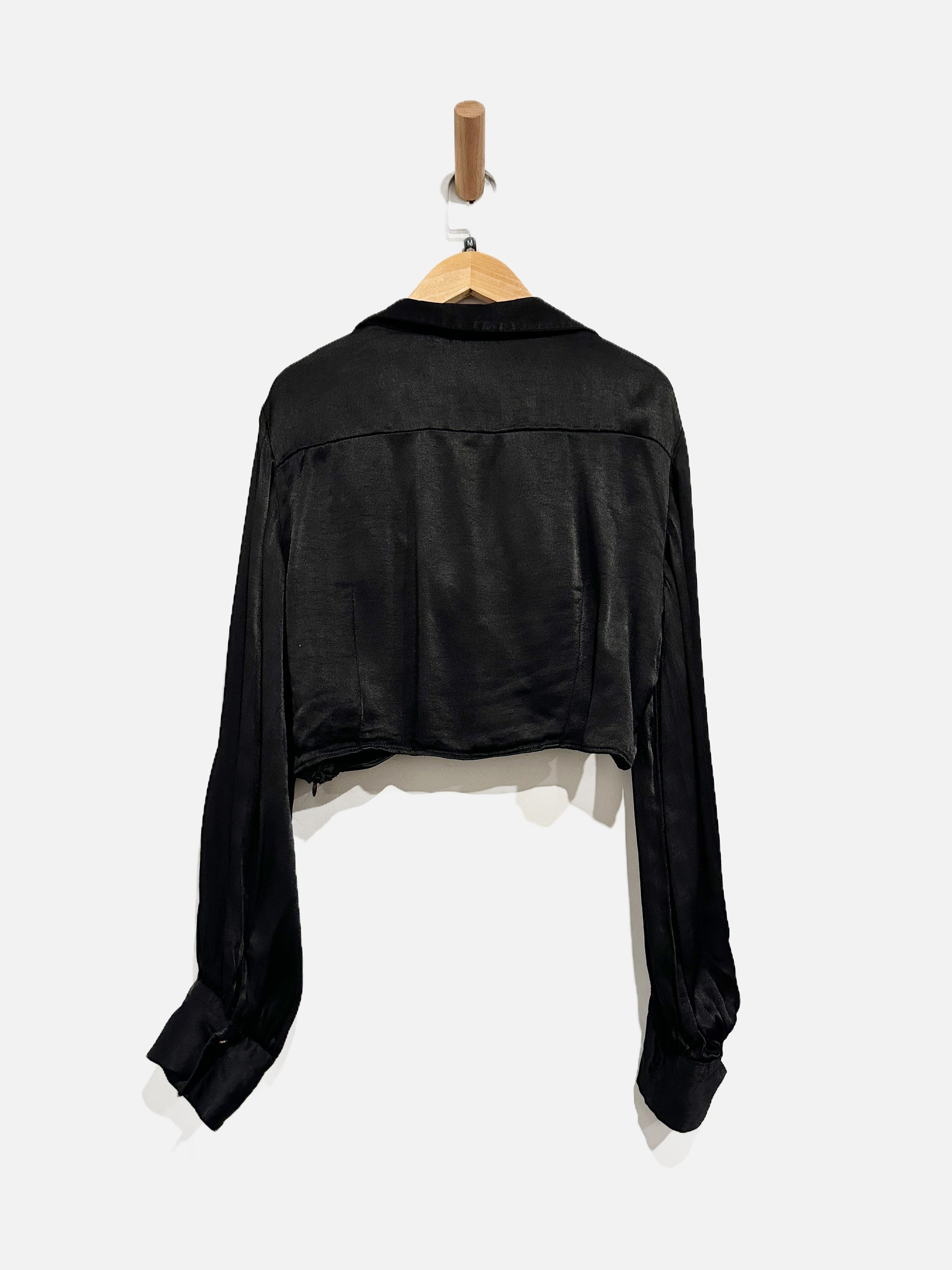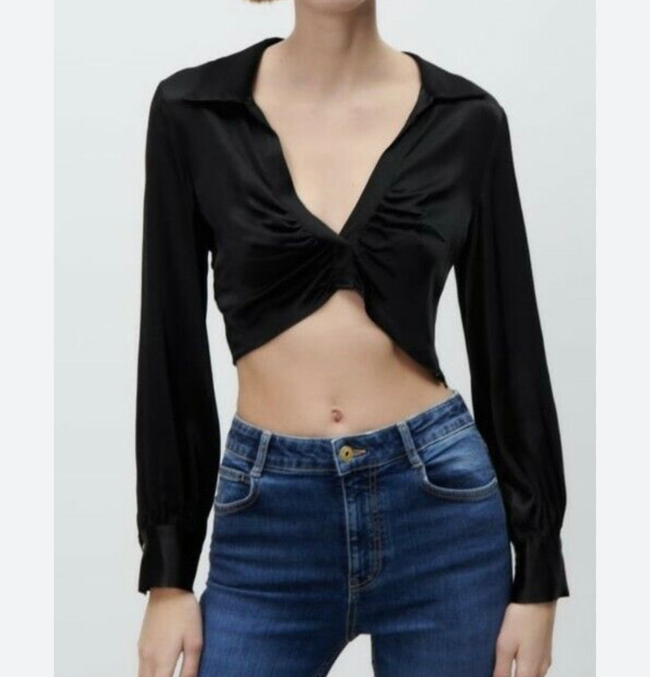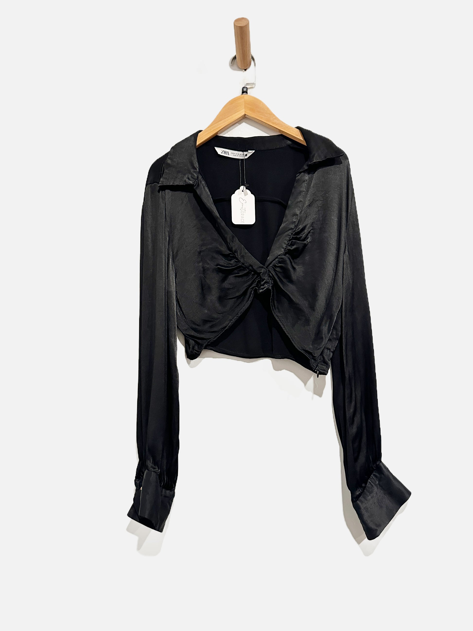 Zara Black Satin Twist Front Crop Blouse - Medium