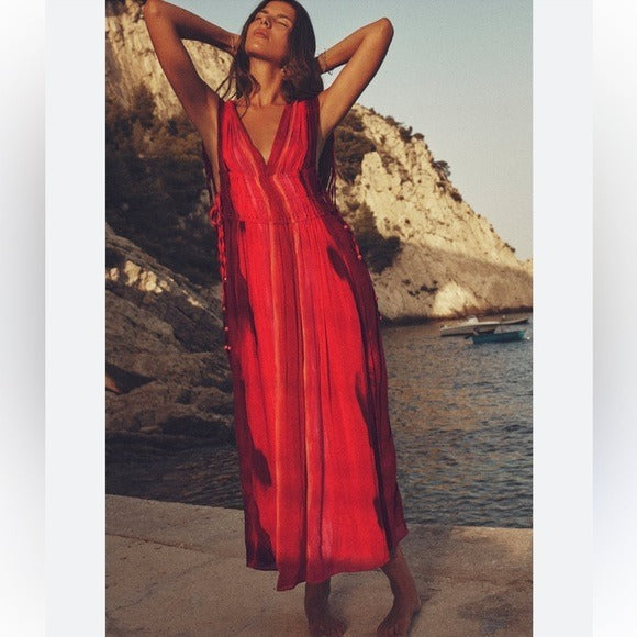 NWT Zara Sleeveless V-Neck Beaded Appliques Tie Dye Midi Dress Size Medium